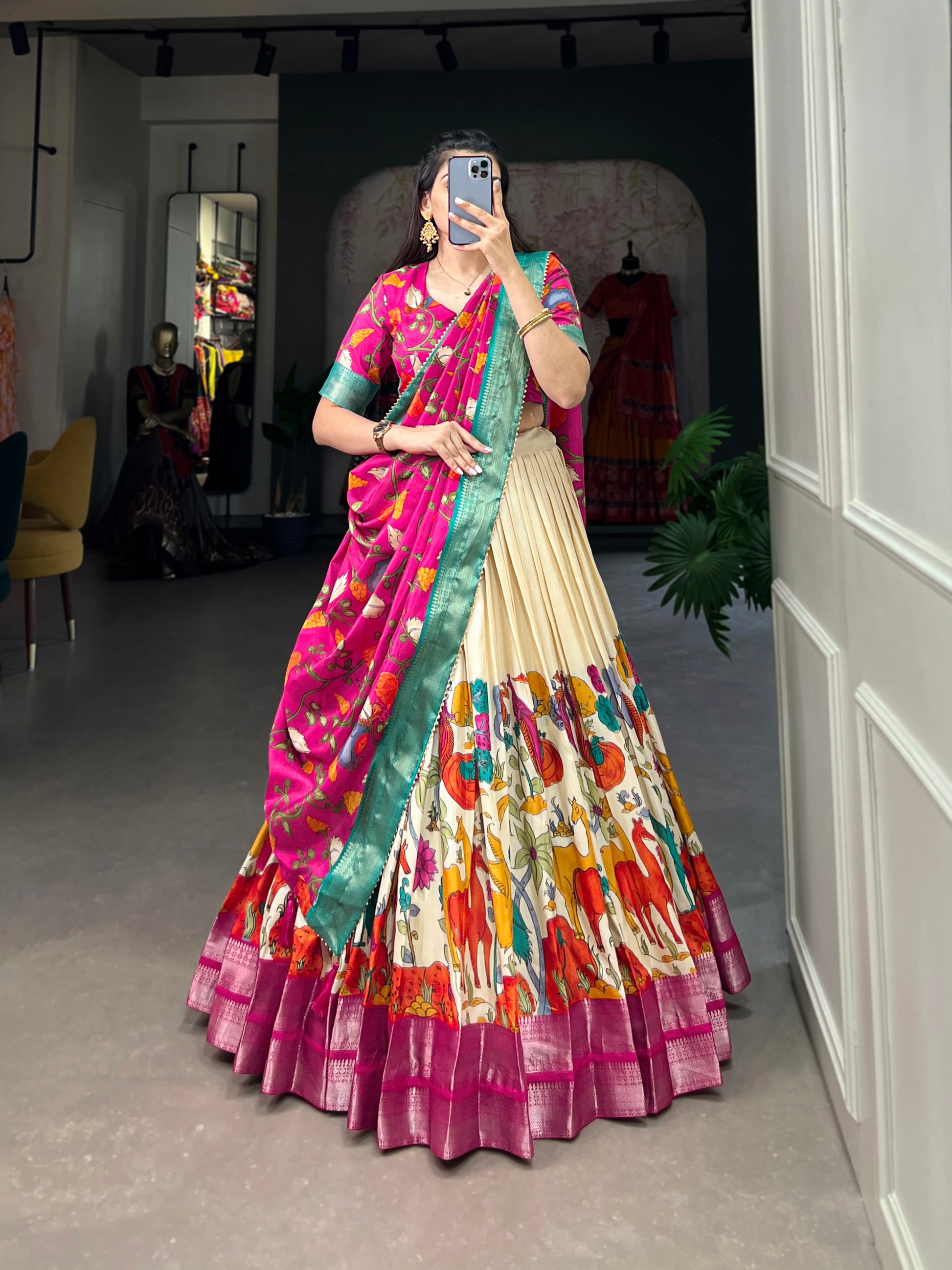Kalamkari Print With Zari Weaving Dola Silk South Indian Lehenga Choli